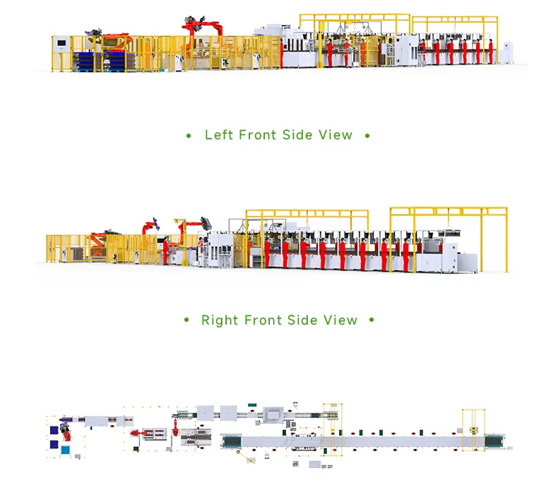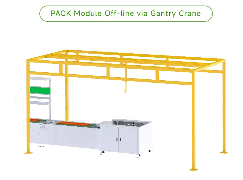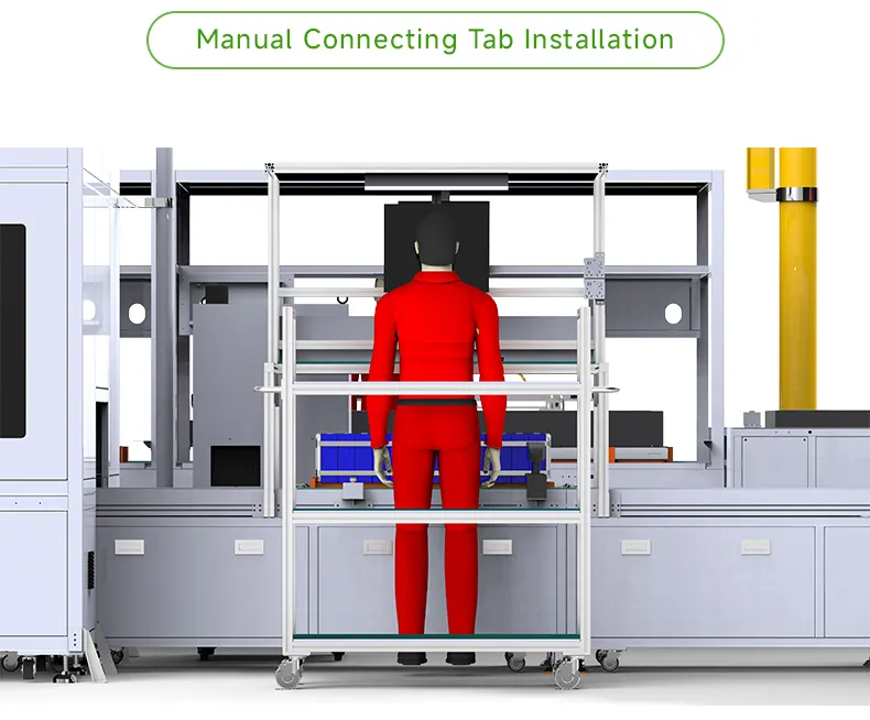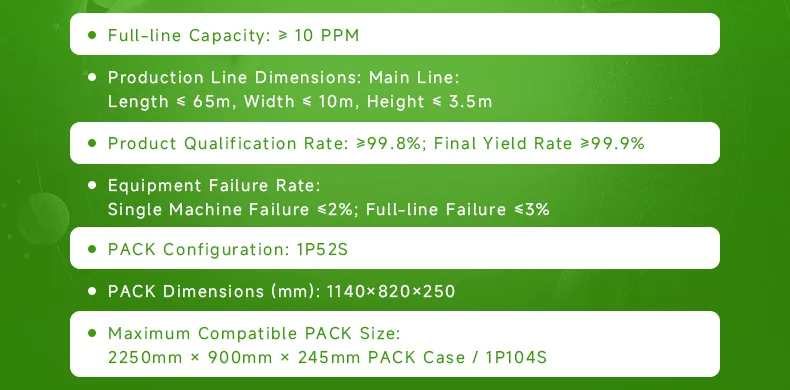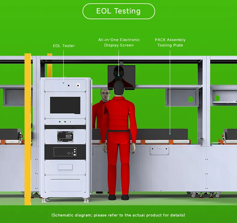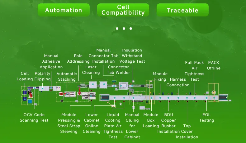 Cell Feeding → OCV Testing → Cell Adhesive Application → Cell Stacking & Manual Strapping → Addressing Cleaning → Busbar Welding → Module EOL Testing → Module Off-Line → Box On-Line → Liquid Cooling Plate Adhesive Application→ PACK EOL Testing → PACK EOL Testing → Complete Package Airtightness Testing → PACK Off-Line